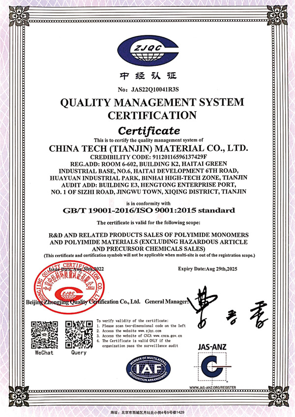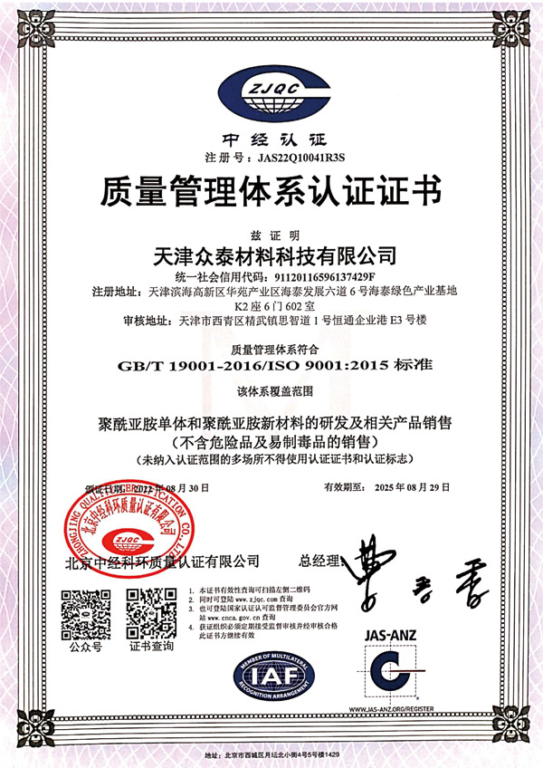 天津眾泰材料科技有限公司(以下簡稱“眾泰”),是一家“以先進功能性聚酰亞胺單體研發(fā)生產(chǎn)為核心,致力于推動全球聚酰亞胺材料產(chǎn)業(yè)發(fā)展”為使命的創(chuàng)新型高新技術企業(yè)。眾泰研制的聚酰亞胺單體目前已廣泛應用于無色透明柔性聚酰亞胺薄膜、柔性顯示材料、5G新材料等諸多高科技領域產(chǎn)品的生產(chǎn)。